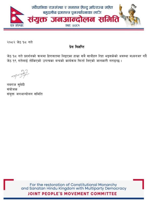 “जेठ १८ गते प्रदर्शनको क्रममा हिरासतमा लिइएका हाम्रा सबै साथीहरू रिहा भइसकेको अवस्था मध्यनजर गर्दै जेठ १९ गतेलाई तोकिएको उपत्यका बन्दको कार्यक्रम फिर्ता लिएको जानकारी गराइन्छ,” नवराज सुवेदी नेतृत्वको संयुक्त जनआन्दोलन समितिले विज्ञप्ति जारी गर्दै भनेका छन् ।