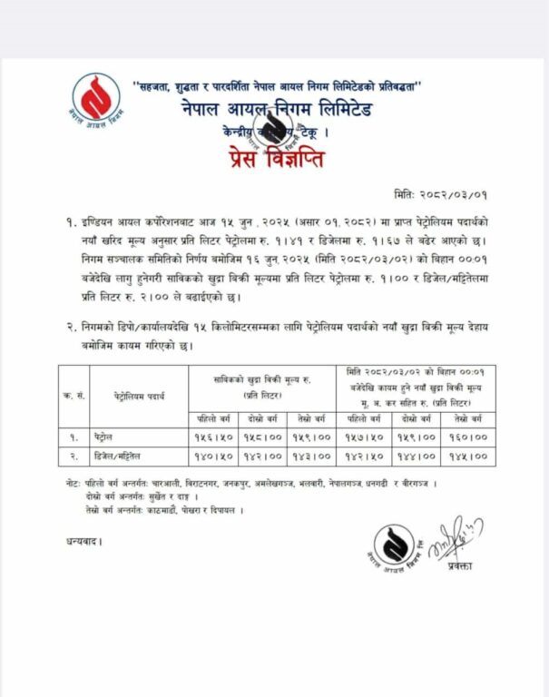 निगमका अनुसार, पेट्रोल प्रतिलिटर एक रुपैयाँ, डिजेल/मट्टीतेल प्रतिलिटर दुई रुपैयाँ बढाइएको छ ।