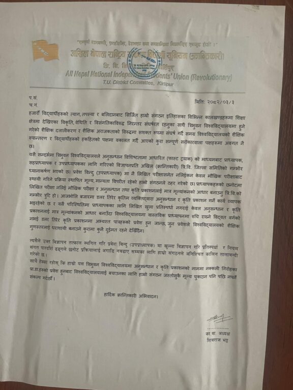 अखिल (क्रान्तिकारी) ले विश्वविद्यालयमा शैक्षिक गुणस्तर रक्षा गर्नका लागि यो प्रक्रिया तत्काल खारेज गरिनु पर्ने माग गर्दै, विज्ञापन र छनोट प्रक्रिया नरोकेसम्म आन्दोलन जारी रहने चेतावनी दिएको छ।
