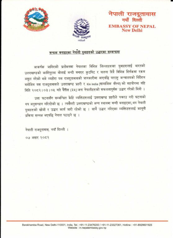 परराष्ट्र मन्त्रालयको निर्देशनमा नेपाली राजदूतावास, नयाँ दिल्लीले उत्तराखण्ड प्रहरी तथा सामाजिक संस्था ‘किन इन्डिया’ को सहयोगमा यही असार ५ गते ती नेपालीहरूको उद्धार गरेको हो।