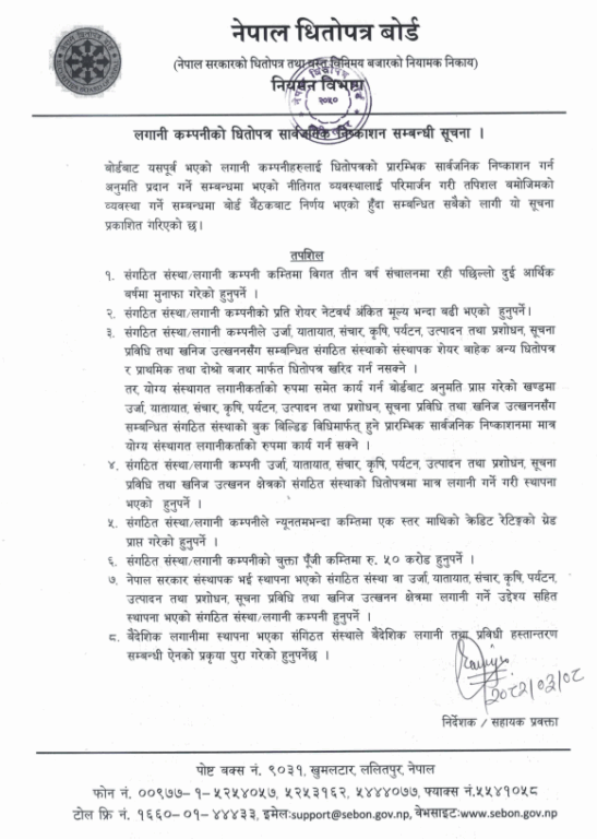 यसैगरी आईपीओ जारी गर्न पाउने कम्पनी सरकार संस्थापक रहेको वा विशिष्ट क्षेत्र (ऊर्जा, कृषि, सञ्चार, आदि) मा लगानी गर्ने उद्देश्यले स्थापित भएको संगठित संस्था हुनुपर्नेछ । वैदेशिक लगानीमा स्थापित कम्पनीले ‘वैदेशिक लगानी तथा प्रविधि हस्तान्तरण ऐन’ अन्तर्गतका सम्पूर्ण प्रक्रिया पूरा गरेको प्रमाणित गर्नुपर्नेछ । यस निर्णयसँगै सेबोनले पूँजी बजारमा पारदर्शिता, क्षेत्रगत प्राथमिकता र दीगो लगानी प्रवाहलाई प्राथमिकता दिँदै लगानी कम्पनीहरूको दायरा स्पष्ट गर्न खोजेको जनाइएको छ।