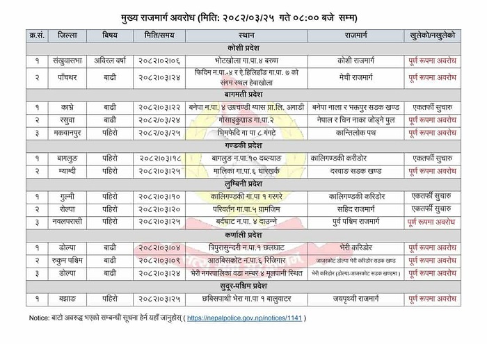 प्रहरीले सडक खुलाउन सम्बन्धित निकायसँग समन्वय गरिरहेको जानकारी दिएको छ र यात्रुहरूलाई यात्रा गर्नु अघि सडक अवस्थाबारे जानकारी लिन अनुरोध गरेको छ।