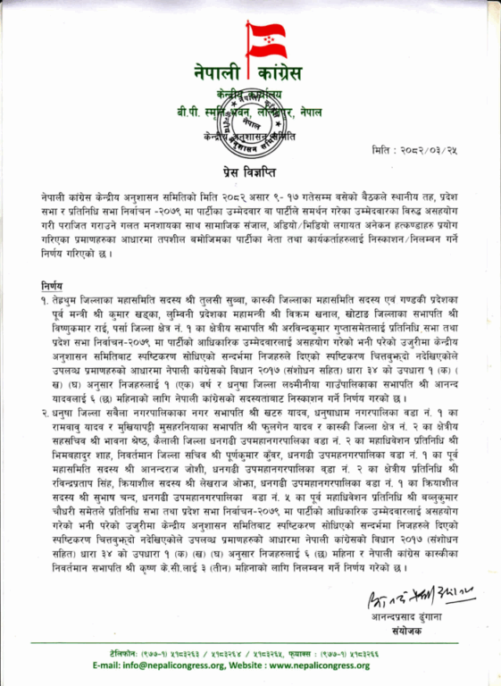 नेपाली कांग्रेसले पार्टीविरोधी गतिविधिमा संलग्न भएको आरोपमा डेढ दर्जनभन्दा बढी नेता तथा कार्यकर्तामाथि अनुशासनात्मक कारबाही गरेको छ। २०७९ सालको निर्वाचनमा पार्टीका उम्मेदवारविरुद्ध कार्य गरेको, सामाजिक सञ्जाल र अन्य माध्यमबाट असहयोग गरेको प्रमाणको आधारमा केन्द्रीय अनुशासन समितिले पाँच जनालाई निष्कासन र अन्यलाई निलम्बन गरेको हो।