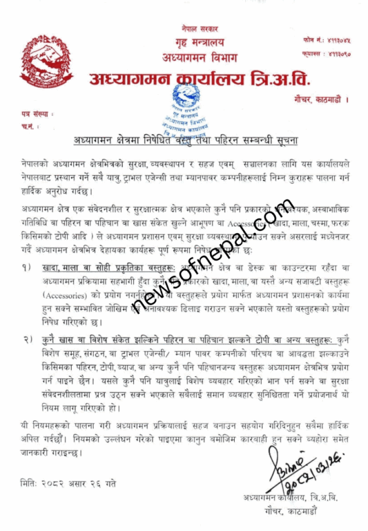 अध्यागमन क्षेत्र एक संवेदनशील र सुरक्षात्मक क्षेत्र भएकाले कुनै पनि प्रकारको अनावश्यक, अस्वाभाविक गतिविधि वा पहिरन वा पहिचान वा खास संकेत खुल्ने आभूषण वा सोहीसँग जोडिएका सामाग्री खादा, माला, चस्मा, फरक किसिमको टोपी निषेध गरेको हो ।