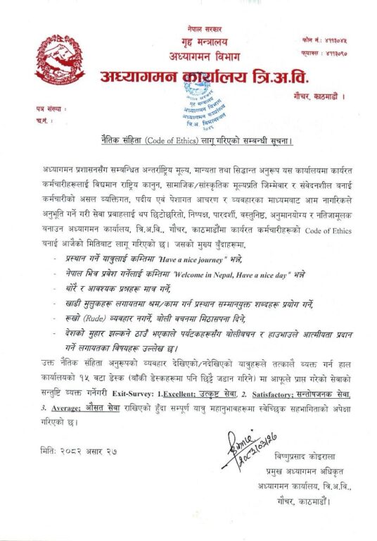 त्रिभुवन अन्तर्राष्ट्रिय विमानस्थलको अध्यागमन कार्यालयले सेवाग्राहीलाई छिटो, छरितो र आत्मीय व्यवहारसहित सेवा प्रवाह गर्न आजदेखि नैतिक संहिता (Code of Ethics) लागू गरेको छ।