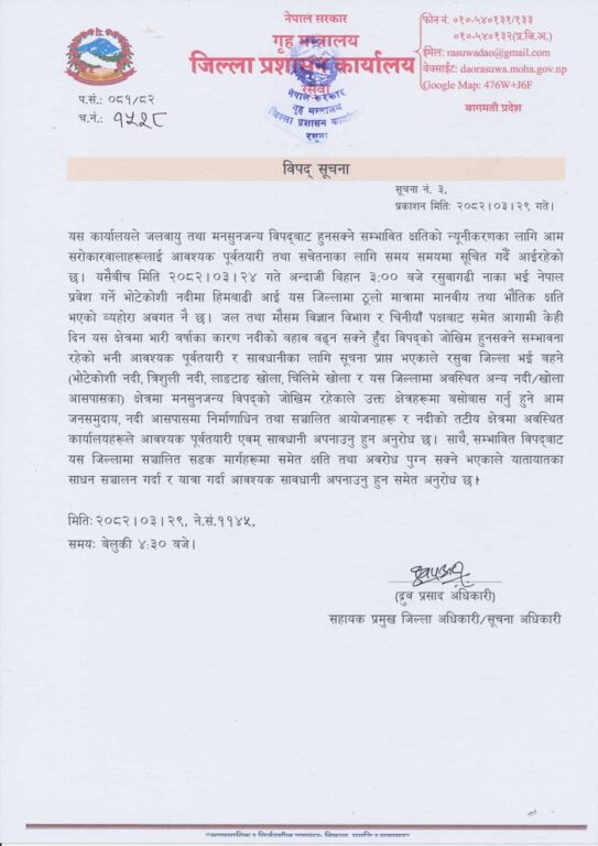 नेपालमा सक्रिय मनसुन प्रणालि र छिमेकि राष्ट्र चिनको तिव्वत क्षेत्रमा समेत मनसुन प्रणालि सक्रिय हुने र बर्षाका कारण भोटेकोशि,त्रिशूली ,चिलिमे ,लाङटाङ लगाएतका नदिहरूमा पानिको वहाव बढन सक्ने र जल तथा मौसम विज्ञान विभाग र चिनियाँ पक्ष ले नेपाल र चिन को सिमाना क्षेत्रमा केही दिन भारि वर्षा हुन सक्ने भन्दै बर्षाका कारण नदिको वहाव बढदा विपद जोखिम हुन सक्ने सुचना पठाएपछि जिल्ला प्रशासन कार्यालय रसुवाले प्रेस विज्ञप्ति मार्फत सुचना जारि गरेको हो ।