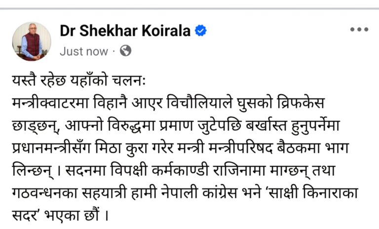 नेपाली कांग्रेसका नेता डा. शेेखर कोइरालाले सामाजिक सञ्जालमार्फत मन्त्रीहरूलाई दिइने संरक्षणको आलोचना गरेका छन्।