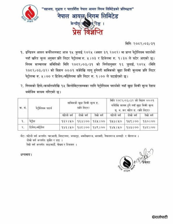 पेट्रोलियम पदार्थको मूल्य घटेको छ । नेपाल आयल निगमका अनुसार पेट्रोल ५ रुपैँयाले घटेको हो भने डिजेल १ रुपैयाँले घटेको हाे । बुधबारदेखि लागू हुनेगरी पेट्राेलियम पदार्थकाे मूल्य घटाइएकाे निगमले जनाएकाे छ ।
