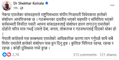 कोइरालाले आफ्नो फेसबुक पोस्टमा भनेका छन्, “एमालेले हालेको संशोधन देश, जनता, लोकतन्त्र र गठवन्धनप्रति धोका हो।” कोइराला भने, “नेपाली कांग्रेसले यस बारेमा एमालेको आधिकारिक धारणा माग गर्नुपर्छ र सबै दल मिलेर यसलाई पास हुन दिनु हुँदैन।”