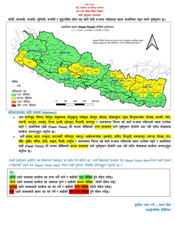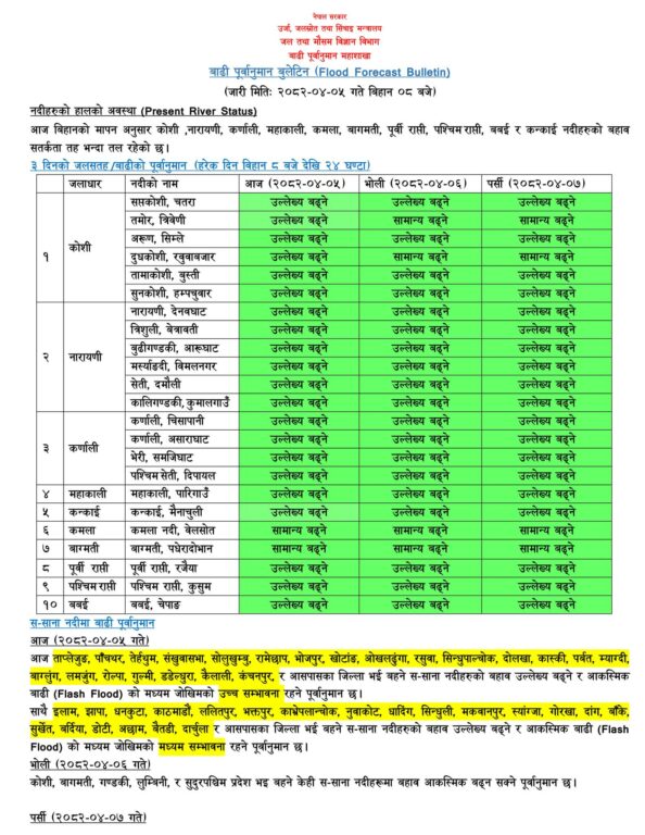 बाढी पूर्वानुमान महाशाखाका अनुसार कोशी, नारायणी, कर्णाली, महाकाली लगायतका प्रमुख नदीहरू सतर्कता तहभन्दा तल छन्। ताप्लेजुङदेखि कञ्चनपुरसम्मका पहाडी जिल्लामा बहने साना नदीहरूमा आकस्मिक बाढीको उच्च सम्भावना छ। साथै काठमाडौँ उपत्यकासहितका अन्य जिल्लामा पनि मध्यम जोखिम रहेको महाशाखाले जनाएको छ।