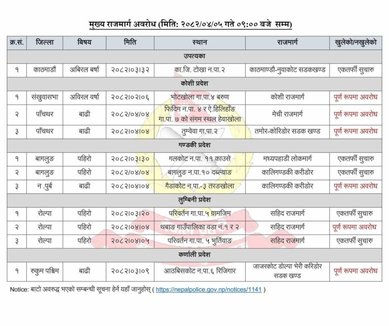 नेपाल प्रहरीले सोमबार बिहान ९ बजे सार्वजनिक गरेको अद्यावधिक विवरण अनुसार संखुवासभाको कोशी राजमार्ग, पाँचथरको मेची राजमार्ग, तमोर–कोरिडोर, नवलपरासी पूर्वको कालिगण्डकी करिडोर, रोल्पाको सहिद राजमार्ग, र रुकुम पश्चिमको भेरी करिडोर सडक अवरुद्ध छन्।