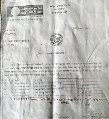 बारा जिल्ला पूर्वाधार विकास कार्यालय कलैयाका निलम्बित प्रमुख राजेन्द्र साहको नामबाट उपभोक्ता समितिको खाता सञ्चालन भइरहेको र करिब १४ करोड रुपैयाँको आर्थिक कारोबार भएको भेटिएको छ।