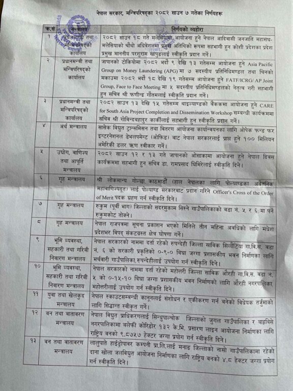 सरकारले बुधबार बसेको मन्त्रिपरिषद् बैठकका १३ वटा निर्णय सार्वजनिक गरेको छ । सरकारका प्रवक्ता एवम् सञ्चार तथा सूचना प्रविधि मन्त्री पृथ्वी सुब्बा गुरुङले नियमित पत्रकार सम्मेलन बुधबार बसेको मन्त्रिपरिषद् बैठकका १३ वटा निर्णय आज सार्वजनिक गरेका हुन् ।