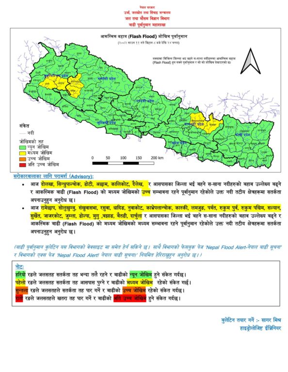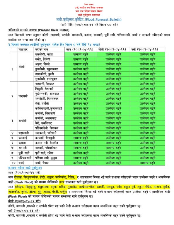 बाढी पूर्वानुमान महाशाखाका अनुसार कोशी, नारायणी, कर्णाली, महाकाली लगायतका प्रमुख नदीहरूको बहाव सतर्कता तहभन्दा तल छ। तर दोलखा, सिन्धुपाल्चोक, डोटी, अछाम, कालिकोट लगायत जिल्लाबाट बहने साना नदीहरूमा आकस्मिक बाढीको मध्यम जोखिम उच्च रहेको छ।