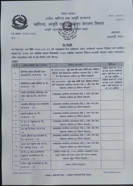 नेपाल सरकार, उद्योग, वाणिज्य तथा आपूर्ति मन्त्रालयअन्तर्गतको वाणिज्य, आपूर्ति तथा उपभोक्ता संरक्षण विभागले उपभोक्ता संरक्षण ऐनको उल्लङ्घन गरेको ठहर गर्दै दुई संस्थालाई लाखौँ रुपैयाँ जरिवाना र अन्य नौ संस्थालाई स्पष्टीकरणका लागि विभागमा उपस्थित हुन निर्देशन दिएको छ।