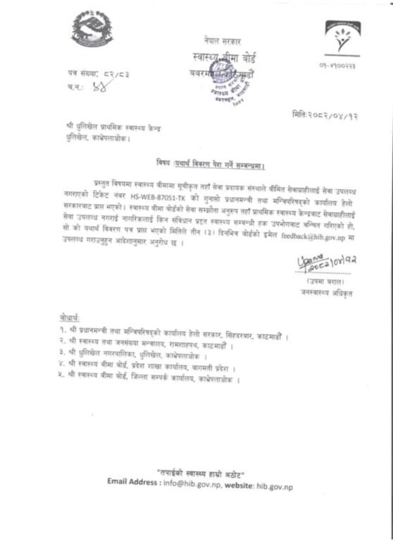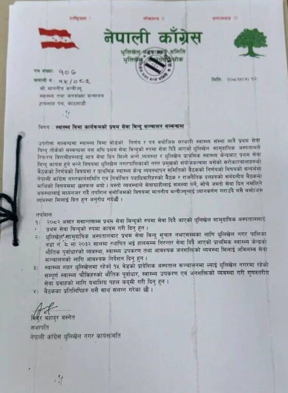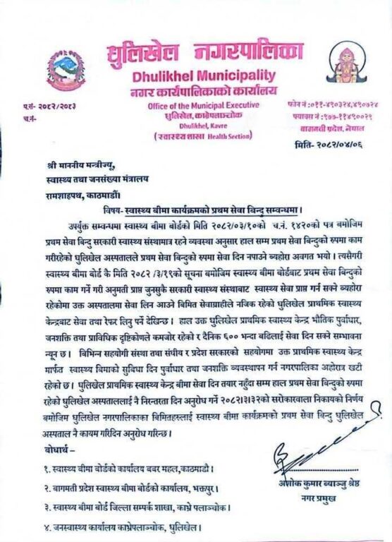 त्यसैगरि सोमबार स्वास्थ्य बीमा कार्यक्रम अन्तर्गत धुलिखेल सामुदायिक अस्पताललाई पहिलो सेवा विन्दुबाट हटाउने सरकारको निर्णयप्रति धुलिखेलका प्रमुख राजनीतिक दलहरूले गम्भीर आपत्ति जनाउँदै नेपाली कांग्रेस, नेकपा माओवादी केन्द्र, नेकपा एकीकृत समाजवादीलगायतका दल र स्थानीय जनप्रतिनिधिहरूले स्वास्थ्य मन्त्री प्रदीप पौडेललाई ज्ञापनपत्र बुझाउँदै निर्णय तत्काल सच्याउन माग गरेका छन् ।