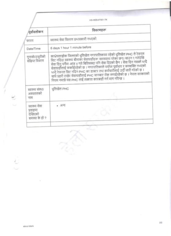 धुलिखेल अस्पताल जस्ता प्रभावकारी सामुदायिक संस्थालाई हटाएर तयारी नपुगेको सरकारी संरचना देखाउँन खोज्नु, नीति त होलान् तर व्यवहारमै धराप बनिरहेको छ । स्थानीय माग र जनताको सहजतालाई बेवास्ता गर्दै गरिएको बीमा सुधारको यो मोडेल स्वास्थ्य सेवामा सुधारभन्दा बढी असहजता र असमानता निम्त्याउने खतरा बनिरहेको छ । सरकारको नीति र स्थानीय यथार्थबीचको यो टकराव तत्काल सम्बोधन नगरे लामो समयसम्म बीमा कार्यक्रममै नागरिकको भरोसा घट्ने सहभागीहरुको निष्कर्ष रहेको छ ।