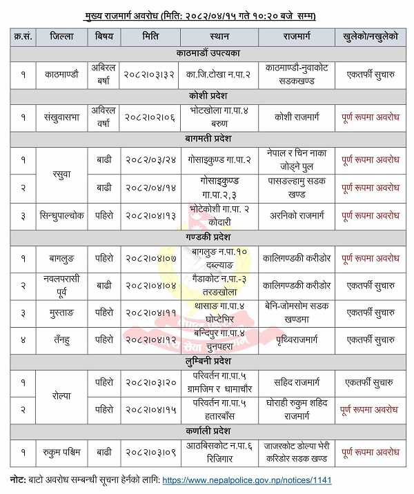 प्रहरीले जनताको सुरक्षाका लागि सावधानी अपनाउन र वैकल्पिक मार्ग प्रयोग गर्न आग्रह गरेको छ।