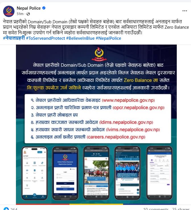 नेपाल प्रहरीले आफ्नो आधिकारिक डोमेन तथा उप-डोमेन (तेस्रो पक्षका सेवाबाहेक) मार्फत सर्वसाधारणलाई प्रदान गरिरहेको अनलाइन सेवाहरू नेपाल दूरसञ्चार कम्पनी लिमिटेड (NTC) र एनसेल आजियाटा लिमिटेड (Ncell) मार्फत अब Zero Balance हुँदा पनि नि:शुल्क प्रयोग गर्न सकिने व्यवस्था गरेको छ।