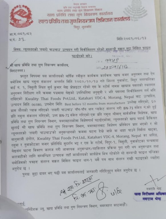 मोरङको कटहरीस्थित विपिन काबराको क्वालिटी थाई फुड प्रा.लि.ले उत्पादन गरेको ‘बुलेट’ चाउचाउमा मापदण्डभन्दा धेरै विषाक्त तत्व भेटिएको छ। नुवाकोटबाट संकलित नमुनाको परीक्षणमा एक्स्ट्रयाक्टेड फ्याट एसिड ७.५ र पेरोक्साइड भ्यालु ३४.९ पाइएको थियो, जुन स्वीकृत सीमाभन्दा धेरै माथि हो।