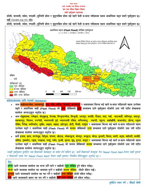 तर, मंगलबार काभ्रे, मकवानपुर, बाँके, कैलाली, कञ्चनपुर लगायतका जिल्लाहरूमा बहने साना नदीहरूमा आकस्मिक बाढीको उच्च जोखिम रहेको छ। साथै, देशका अन्य धेरै जिल्लामा मध्यम जोखिमको सम्भावना पनि पूर्वानुमान गरिएको छ। सतर्कता अपनाउन आग्रह गरिएको छ।