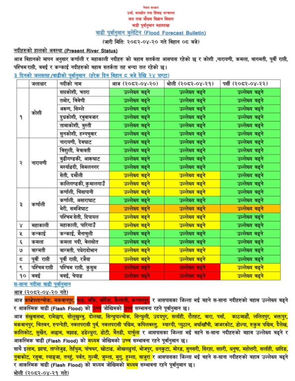 बाढी पूर्वानुमान महाशाखाका अनुसार कर्णाली र महाकाली नदी सतर्कता आसपास छन् भने कोशी, नारायणी, बागमती, कमला, राप्ती, बबई, कन्काई लगायतका नदीहरू सामान्य अवस्थामा छन्।