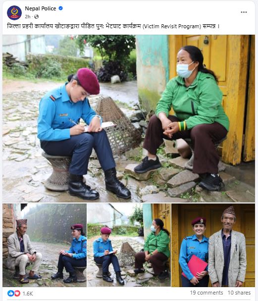 जिल्ला प्रहरी कार्यालय खोटाङद्वारा पीडित पुनः भेटघाट कार्यक्रम (Victim Revisit Program) सम्पन्न गरिएको छ। कार्यक्रममा पहिले अपराधबाट पीडित व्यक्तिहरूसँग पुनः सम्पर्क गरी उनीहरूको हालको अवस्था, सुरक्षाको अवस्था र न्याय प्राप्तिको अनुभवबारे जानकारी लिइएको थियो।