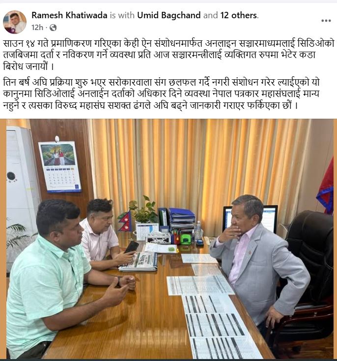 नेपाल पत्रकार महासङ्गका बरिष्ठ उपाध्यक्ष दीपक आर्चाय र महासङ्गका सचिब रमेश खतिवडाले आज, संचार मन्त्री पृथ्वी सुब्बा गुरुङसँग भेट गरि सरोकारवालासँग छलफल नगरी एकतर्फी रूपमा संशोधन गरिएकोमा महासंघले उक्त व्यवस्थाविरुद्ध सशक्त रूपमा अघि बढ्ने चेतावनी दिएका हुन् ।