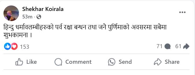 नेपाली कांग्रेसका नेता डा.शेखर कोइरालाले हिन्दु धर्मावलम्बीहरुको प्रमुख पर्व रक्षा बन्धन र जनै पूर्णिमाको अवसरमा सबैमा शुभकामना व्यक्त गरेका छन्।