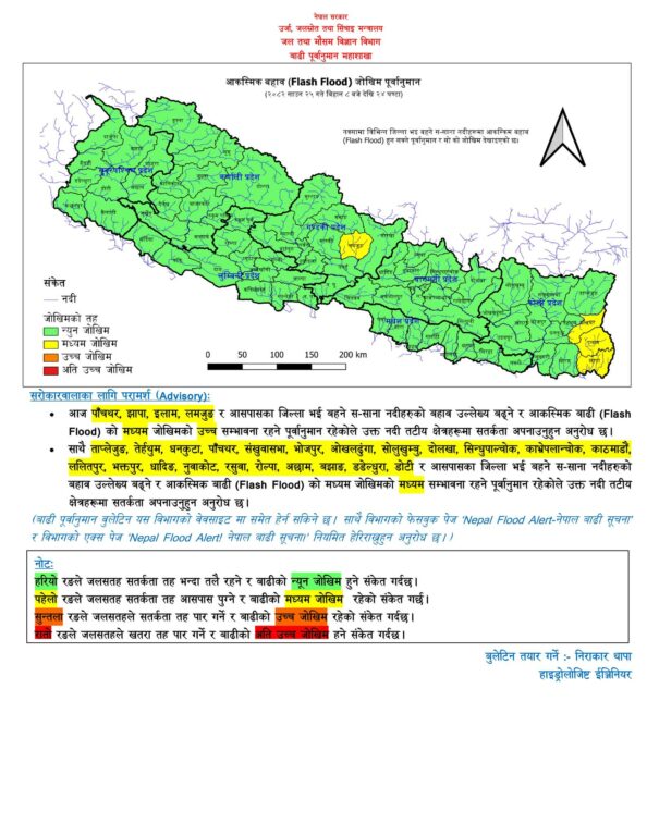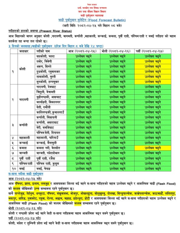 यसैगरी, ताप्लेजुङदेखि डोटी र बझाङसम्मका थुप्रै जिल्लाहरूमा साना नदीहरूमा बहाव उल्लेख्य बढ्ने र आकस्मिक बाढीको मध्यम जोखिम रहेको पूर्वानुमान गरिएको छ। सतर्क रहन विज्ञहरूको आग्रह छ।