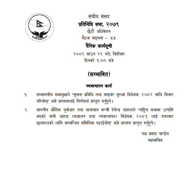 सङ्घीय संसद् प्रतिनिधिको बैठक आज दिउँसो १ बजे बस्ने भएको छ। बैठकमा सभामुखले सूचना प्रविधि तथा साइबर सुरक्षा विधेयक, २०८२ माथि विचार गरियोस् भन्ने प्रस्ताव निर्णयार्थ प्रस्तुत गर्ने कार्यक्रम छ।