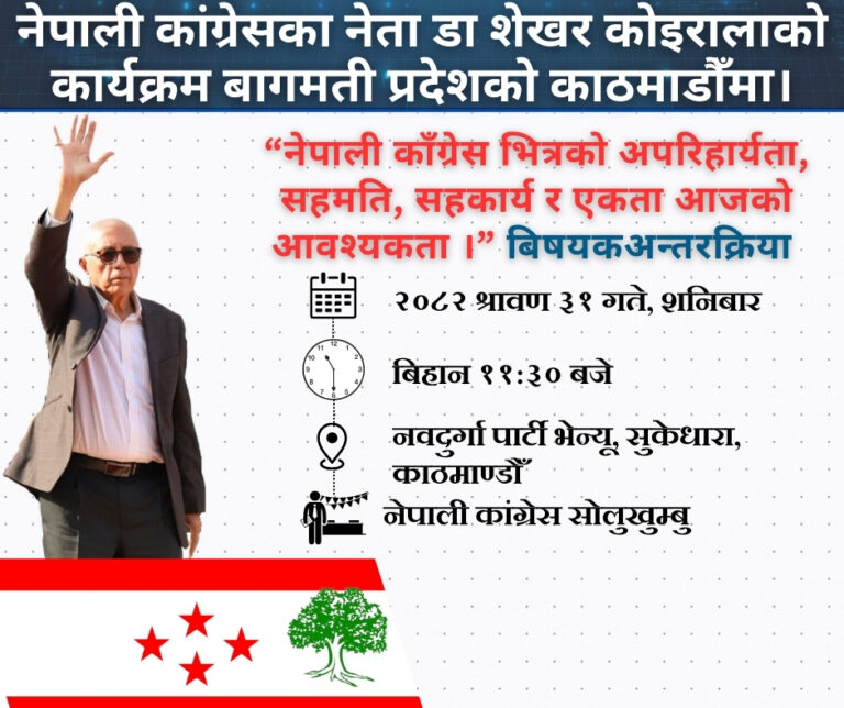 नेपाली काँग्रेसका नेता डा. शेखर कोइरालाको विशेष अन्तरक्रिया कार्यक्रम बागमती प्रदेशको काठमाडौंमा हुने भएको छ।