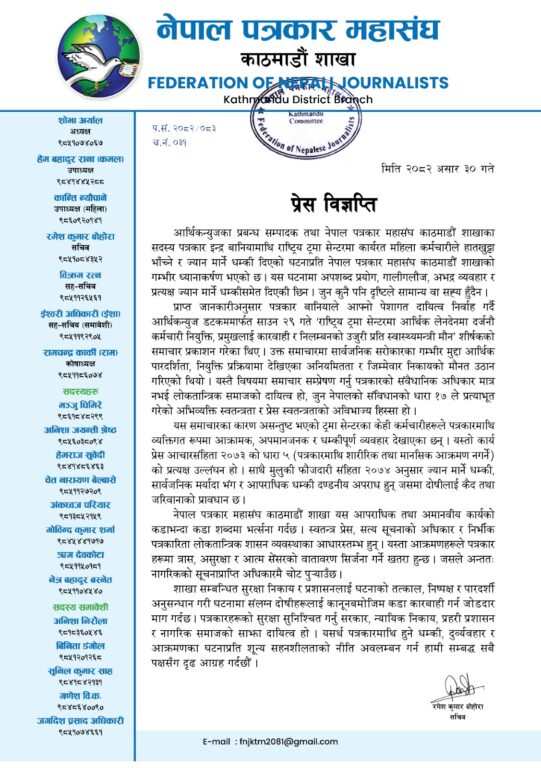 आर्थिकन्युजका प्रबन्ध सम्पादक तथा नेपाल पत्रकार महासंघ काठमाडौं शाखाका सदस्य पत्रकार इन्द्र बानियामाथि राष्ट्रिय ट्रमा सेन्टरमा कार्यरत एक महिला कर्मचारीले हातखुट्टा भाँच्ने र ज्यान मार्ने धम्की दिएको घटनाप्रति नेपाल पत्रकार महासंघ काठमाडौं शाखाले कडा आपत्ति जनाएको छ ।
