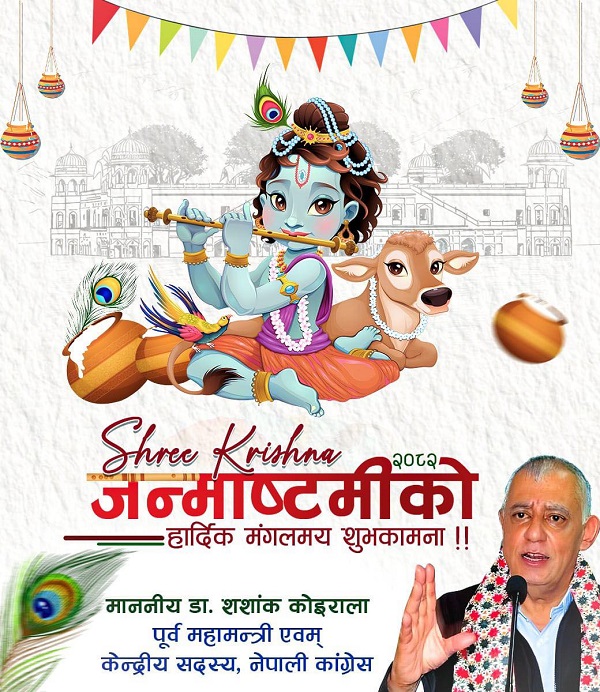 नेपाली कांग्रेसका नेता डा. शंशाक कोइरालाले श्रीकृष्ण जन्माष्टमीको अवसरमा नेपाल र विदेशमा रहनुभएका सम्पूर्ण दिदीबहिनी तथा दाजुभाइहरूलाई शुभकामना व्यक्त गरेका छन्।