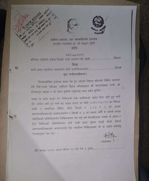 सर्वोच्च अदालतले झापा निवासी भगवती देवी तुङ्गीले प्रहरी प्रधान कार्यालय, नक्सालका महानिरीक्षकविरुद्ध दर्ता गर्न खोजिएको उजुरी किन अस्वीकृत गरियो भनेर स्पष्टिकरण मागेको छ।