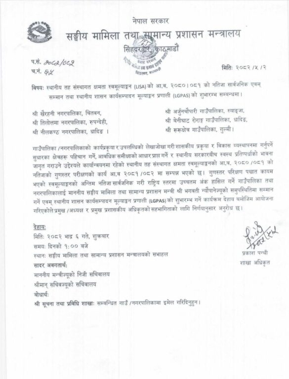 गाउंपालिका, नगरपालिकाको कार्यप्रकृया र उपलब्धीको लेखा जोखा गरी शासकिय प्रकृया र विकास व्यवस्थापनमा गर्नु पर्ने सुधारका क्षेत्रहरु पहिचान गर्ने आवधिक समिक्षाको आधार प्राप्त गर्ने र स्थानिय सरकार बीच स्वस्थ प्रतिष्पर्धाको भावना जागृत गराउने उद्देश्यले कार्यान्वयनमा रहेको स्थानिय तह संस्थागत क्षमता स्वमूल्याकंनको आर्थिक वर्ष २०८०। ०८१ को नतिजाको गुणस्त्तर परिक्षणको कार्य आर्थिक वर्ष ०८१।०८२ मा सम्पन्न भएको हो ।