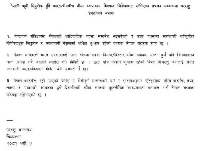 मन्त्रालयका अनुसार नेपाल–भारतबीचको सम्बन्ध ऐतिहासिकरूपमा घनिष्ठ र मैत्रीपूर्ण रहेको उल्लेख गर्दै दुवै देशबीचको सीमा समस्या शान्तिपूर्ण र कूटनीतिक माध्यमबाट समाधान गर्न नेपाल प्रतिबद्ध रहेको दोहोर्याइएको छ।