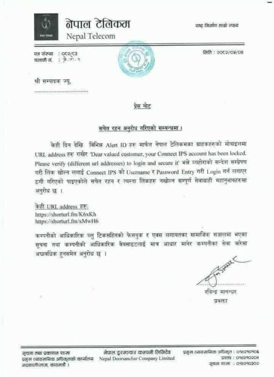 नेपाल टेलिकमले हालै एक प्रेस विज्ञप्ति जारी गर्दै केही दिनदेखि “Connect IPS” को नाममा ग्राहकहरूलाई ठग्ने प्रयास भइरहेको जानकारी दिएको छ। विज्ञप्तिमा भनिएको छ कि ठगहरूले विभिन्न URL लिंक पठाएर “Your Connect IPS account has been locked” भन्ने सन्देश पठाइरहेका छन् र ग्राहकलाई त्यही लिंकमा लगइन गर्न लगाएर जानकारी चोरी गर्ने प्रयास गरिरहेका छन्।