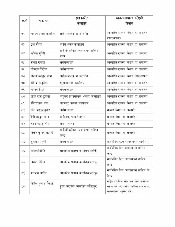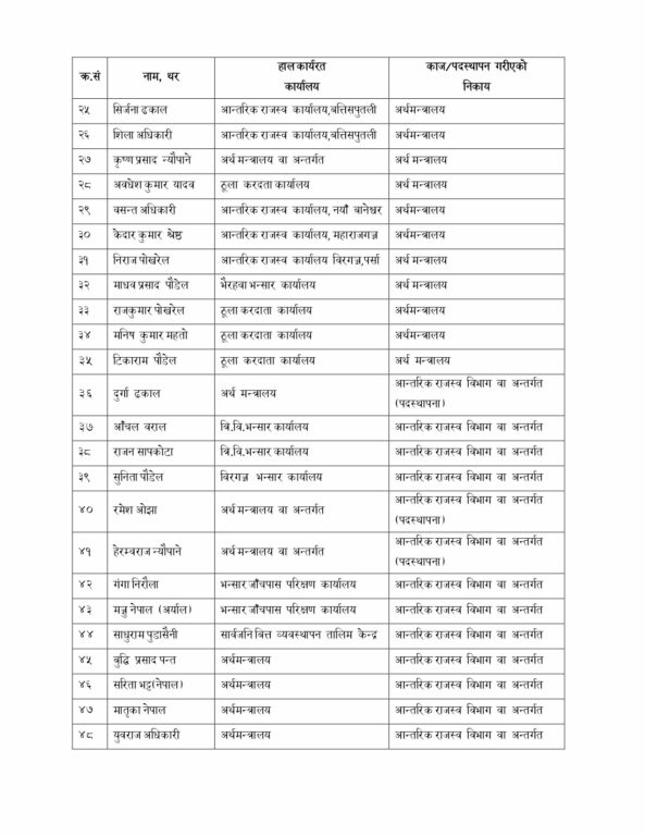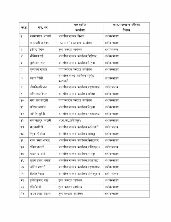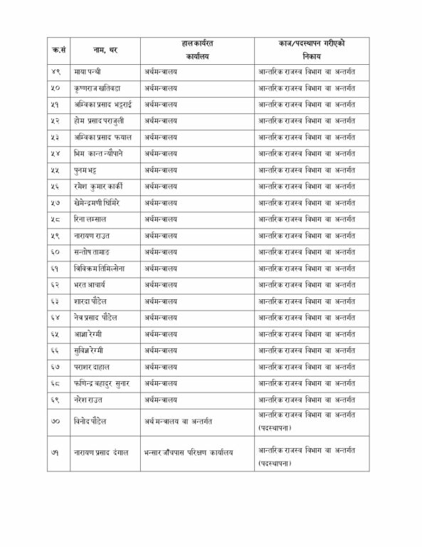 रसुवागढी भन्सारका रवीन्द्र प्याकुरेललाई आन्तरिक विभागमा तानिएको छ भने ठूला करदाता कार्यालय, ललितपुरका निर्मलकुमार मैनालीलाई राष्ट्रिय प्राकृतिक तथा वित्त आयोगमा पठाइएको छ।