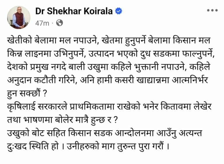 नेपाली कांग्रेसका नेता डा. शेखर कोइरालाले कृषकलाई हेप्ने सरकारी नीतिप्रति कडा आपत्ति जनाएका छन् ।