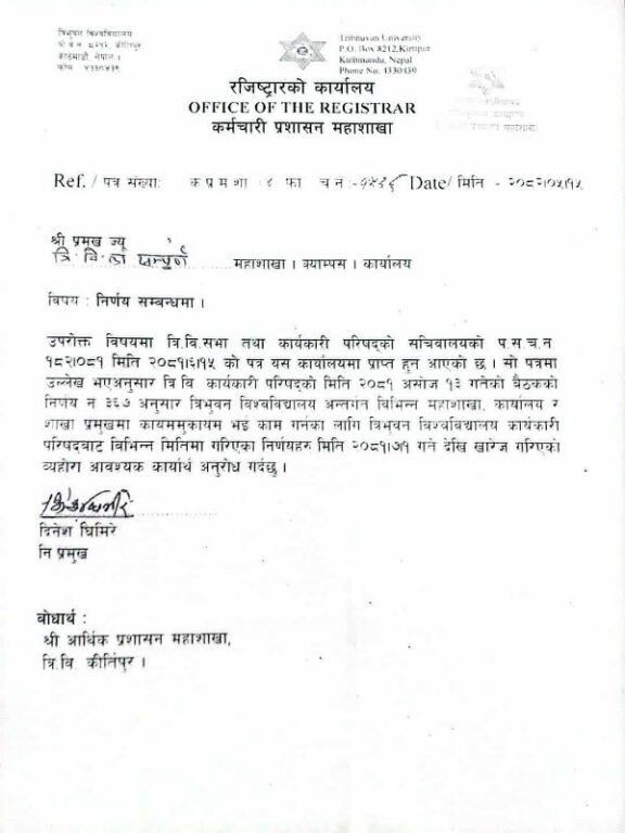 स्रोतका अनुसार दुई दिनअघि सार्वजनिक गरिएको पत्र गत असोज १५ गते रजिस्टारको कार्यालयमा आएको हो । पत्रमा त्रिवि कार्यकारी परिषद्को २०८१ असोज १३ गतेको बैठकले त्रिभुवन विश्वविद्यालयअन्तर्गत विभिन्न महाशाखा, कार्यालय र शाखाको प्रमुखमा कायममुकायम भई काम गर्नका लागि त्रिभुवन विश्वविद्यालय कार्यकारी परिषद्बाट विभिन्न मितिमा गरिएका निर्णय २०८१ कात्तिक १ गतेदेखि खारेज गरिएको उल्लेख छ ।