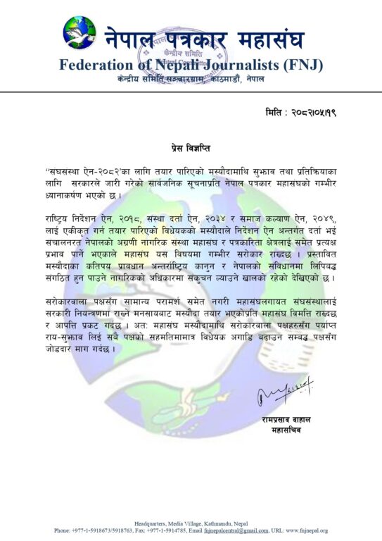 नेपाल पत्रकार महासंघले सरकारले सार्वजनिक सुझावका लागि ल्याएको ‘संघसंस्था ऐन–२०८२’ को मस्यौदाप्रति गम्भीर आपत्ति जनाएको छ।