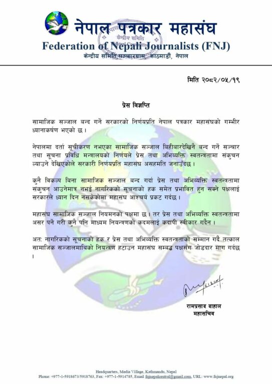सरकारले सूचीकृत नभएका सामाजिक सञ्जाल बन्द गर्ने निर्णय गरेकोमा नेपाल पत्रकार महासंघले गम्भीर ध्यानाकर्षण जनाएको छ। महासंघले उक्त निर्णय प्रेस तथा अभिव्यक्ति स्वतन्त्रता र नागरिकको सूचना प्राप्तिको अधिकारमाथि प्रहार भएको भन्दै आपत्ति जनाएको छ।