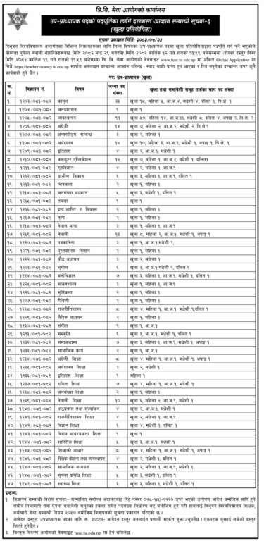 सबैभन्दा धेरै व्यवस्थापन संकायका लागि ९१ पद खुला गरिएको छ भने कानुनमा ३३, अर्थशास्त्रमा १८, अंग्रेजीमा १४, नेपालीमा १३, कम्प्युटर एप्लिकेसनमा १२ र नेपाली शिक्षा विषयमा १० पद खुलाइएको छ।