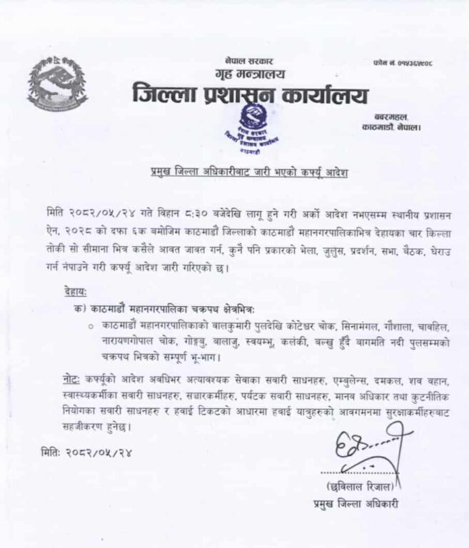 प्रजिअ रिजालका अनुसार काठमाडौं महानगरपालिकाको बालकुमारी पुलदेखि कोटेश्वर चोक, सिनामंल, गौशाला, चाबहिल, नारायणगोपाल चोक, गोंगबु, बालाजु, स्वयम्भु, कलंकी, बल्खु हुँदै बागमती नदी पुलसम्मको चक्रपथभित्रको सम्पूर्ण भूभागमा कर्फ्यू लगाइएको हो ।