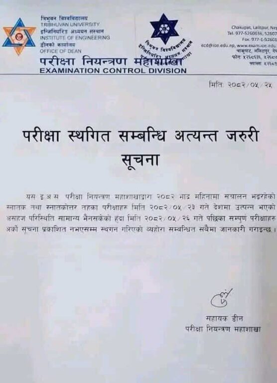 सोमबार र मंगलबार देशैभरी जेनजी आन्दोलन उग्र बनेपछि परीक्षा नियन्त्रण कार्यालयले यही भदौ २६ गतेदेखि पछिका सबै परीक्षा स्थगित गरेको त्रिविले जनाएको हो ।