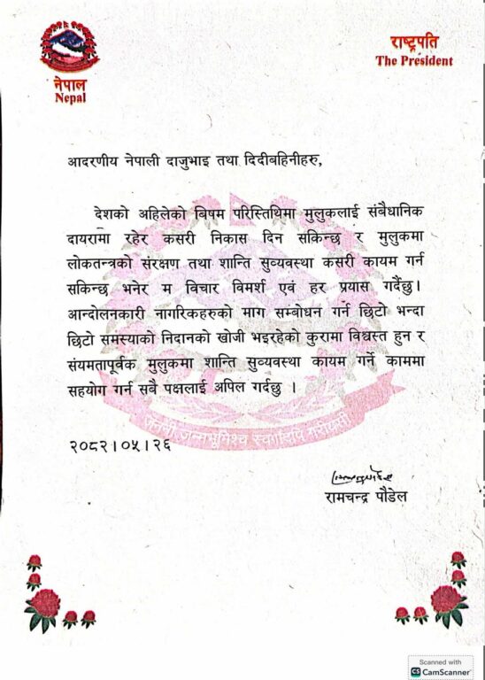 राष्ट्रपति रामचन्द्र पौडेलले देशको वर्तमान विषम परिस्थितिमा मुलुकलाई संवैधानिक दायरामा रहेर कसरी निकास दिन सकिन्छ र मुलुकमा लोकतन्त्रको संरक्षण तथा शान्ति सुव्यवस्था कसरी कायम गर्न सकिन्छ भनेर आफूले विचार–विमर्शसहित हरसम्भव प्रयास गरिरहेको जानकारी गराएका छन् ।