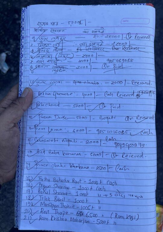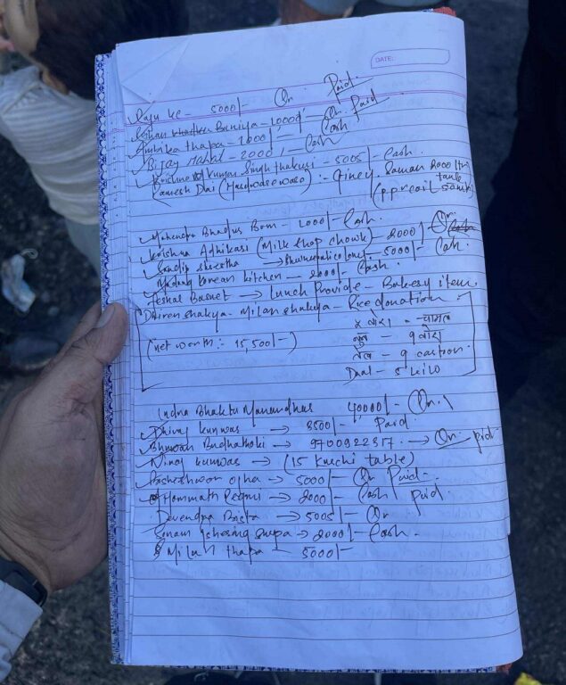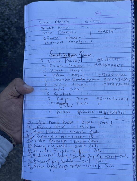 संयोजक महतले ५० हजार १ रुपियाँ नगद र भवनमा ध्वस्त भएको बत्ती व्यवस्थापन गरेका थिए । त्यस्तै प्रगति युवा क्लबले २० हजार नगर, ३ दिनको लागि पुग्ने रासन, पानी ट्याङकी सहयोग गरेको छ । क्लबका सचिव प्रविण थापाले प्रहरीकोलागि डाटा सुरक्षित गर्न एकथान ल्यापटप दिएका थिए । त्यस्तै लालिमा रेस्टुरेन्टले, भैसेपाटी स्पोट्र्स एकेडेमी सानो खोकना र एकेडेमीका अध्यक्ष मिलन थापा, पत्रकार ईश्वरराज ढकाल, समाजसेवी श्रीकृष्ण थापा र गमला घरका संचालक दिपेन्द्र तुलाधरले ५–५ हजार रुपिया आर्थिक सहयोग गरेका थिए ।