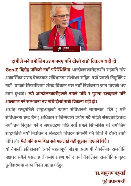 पूर्वप्रधानमन्त्री डा . बाबुराम भट्टराईले नेपालको पछिल्लो राजनीतिक घटनाक्रमलाई दोस्रो राम्रो विकल्पु को रूपमा लिएका छन्। उनले सामाजिक सञ्जालमा एक सन्देश पोस्ट गर्दै हालको परिस्थितिमा संविधान संशोधन गरी नयाँ प्रधानमन्त्रीको नियुक्ति र त्यसपछि संसद् विघटन गरेर नयाँ निर्वाचनमा जानु उत्तम विकल्प रहेको बताएका छन्।