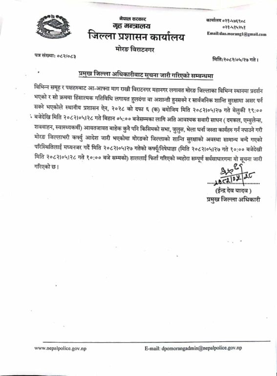 मोरङ जिल्लामा जारी गरिएको कर्फ्यु र निषेधाज्ञा अब हटाइएको छ। जिल्ला प्रशासन कार्यालय मोरङले आज बिहान 1०:०० बजेबाट ती आदेशहरू फिर्ता लिएको घोषणा गरेको हो। प्रशासनका अनुसार, जिल्लामा शान्ति र सुरक्षाको अवस्था सामान्य बनेको र यसले जनजीवनलाई अब सहज बनाउन मद्दत गर्ने विश्वास गरिएको छ।